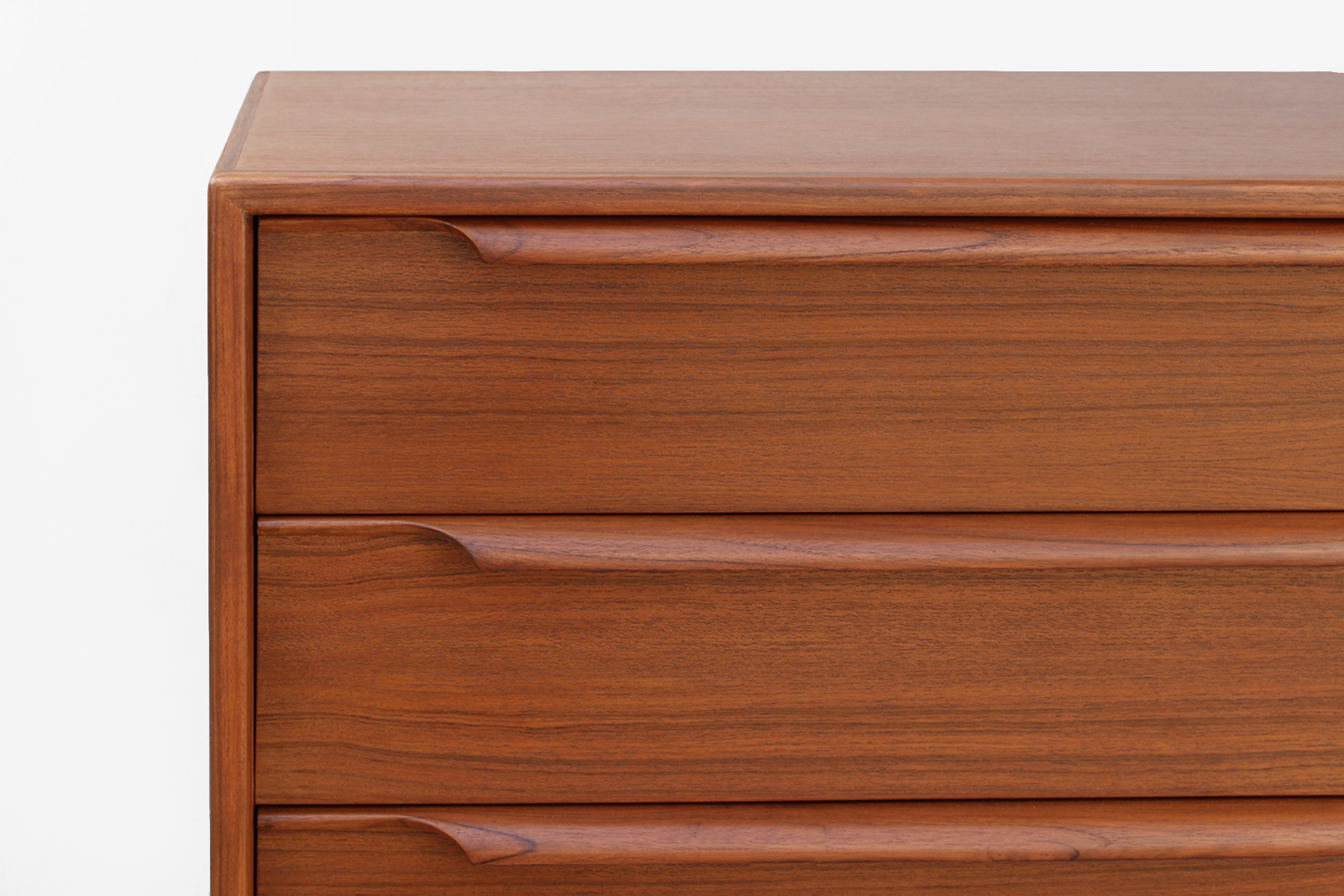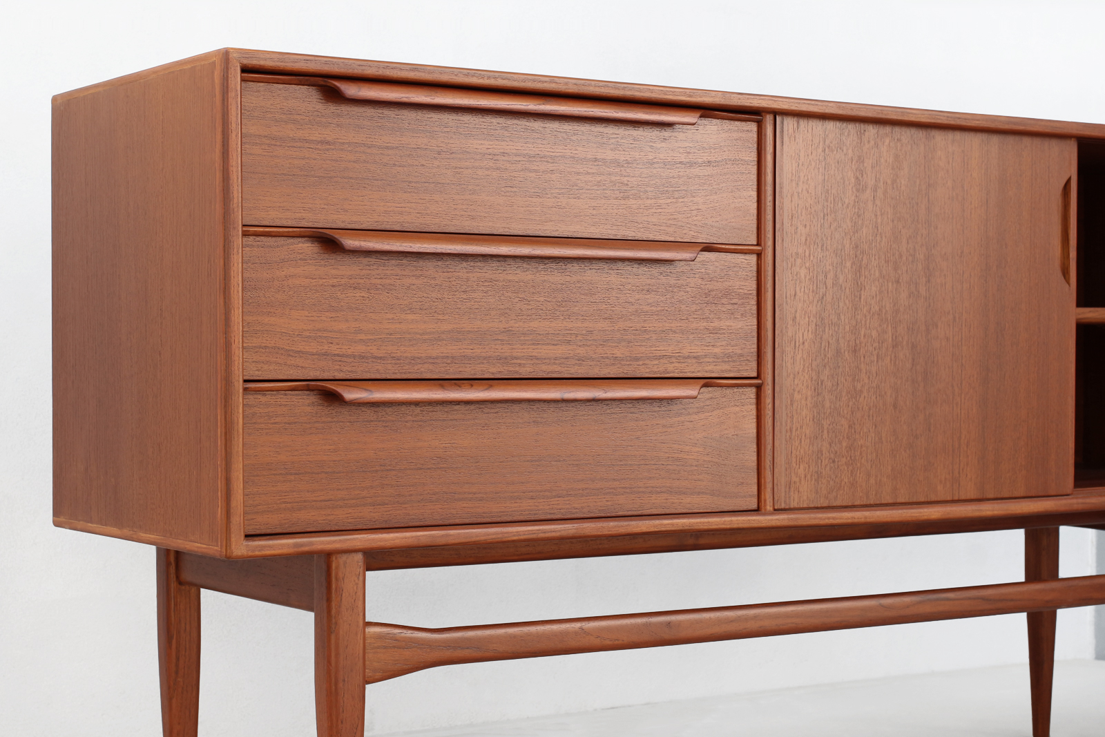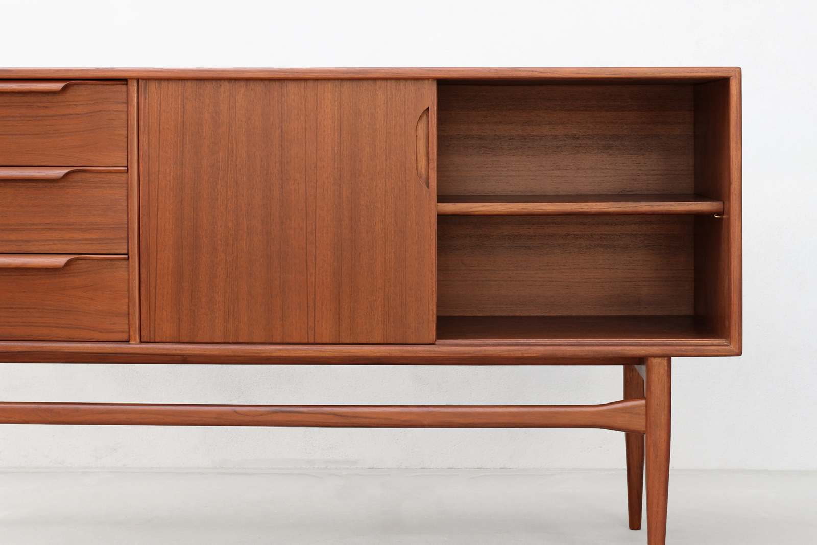 北欧デザイン家具Klokken(クロッケン)サイドボード。日本の暮らしに使いやすいコンパクトなサイドボードです。天板に花瓶やオブジェ、絵などを飾ることで、壁面を活かした空間づくりをお楽しみいただけます。すっきりとしたデザインに見えますが、それぞれのパーツを複雑に作り込こんでいます。四角から丸に形状が変化する長い脚や、削り出した引き出しの取っ手など、手仕事だから作れる形状にこだわりました。また収納には大きな引き出しが3杯と、引き戸の中には取り外し可能な棚板が一枚付属しており、生活感の出やすい物をすっきりと片付けることができます。可動部のレールを木製にすることで開閉時の音がやさしく、使うほどに素材の心地よさを感じられます。引き出し内部もチーク材で仕上げるなど、細部にまで北欧ミッドセンチュリー家具の思想を落とし込み、素材・構造ともにこだわって作り上げたサイドボードです。